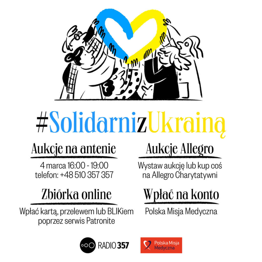 Na co zbieramy? W ukraińskich szpitalnych magazynach brakuje podstawowych produktów. Bez nich lekarze nie mogą skutecznie udzielać pomocy medycznej. Dlatego wspólnie zz Radiem 357 organizujemy specjalną aukcję charytatywną. Z zebranych środków zakupimy potrzebne leki i opatrunki.
